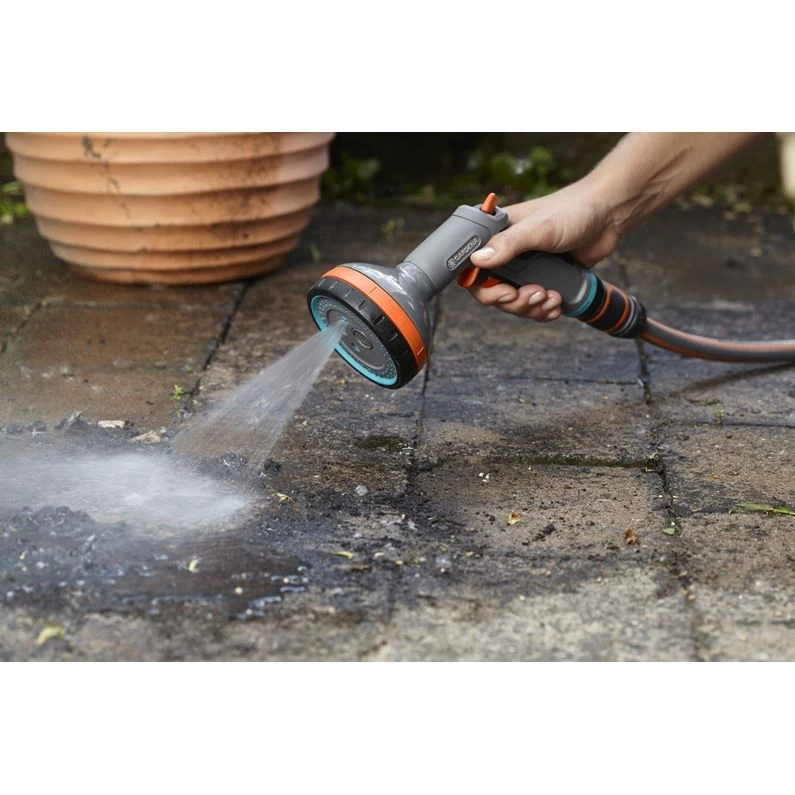 Dankzij de Multifunctionele Gardena Comfort Multie Broes, hoeft u voor verschillende doeleinden niet meer van spraykop te wisselen. Bij deze broes is de waterstraal namelijk instelbaar in vijf standen. De nevelstraal is bijvoorbeeld perfect voor het bewateren van zaaigoed. De zachte straal of broesstraal zorgt ervoor dat de bloembedden goed kunnen worden bewaterd. De harde straal is voor reinigingswerkzaamheden. De softgrip componenten zorgen voor een slipvaste grip op de Comfort multibroes. De ergonomisch vormgegeven impulshendel kan met de geïntegreerde knop worden vastgezet. De waterstraal is met 1 vinger traploos in te stellen. Een geïntegreerd filter zorgt er voor dat er geen vuil in de broes zelf kan komen. Dit filter kan eenvoudig worden losgehaald en gereinigd. De broes is vorstbestendig en daardoor ook bestand tegen temperaturen onder het vriespunt.