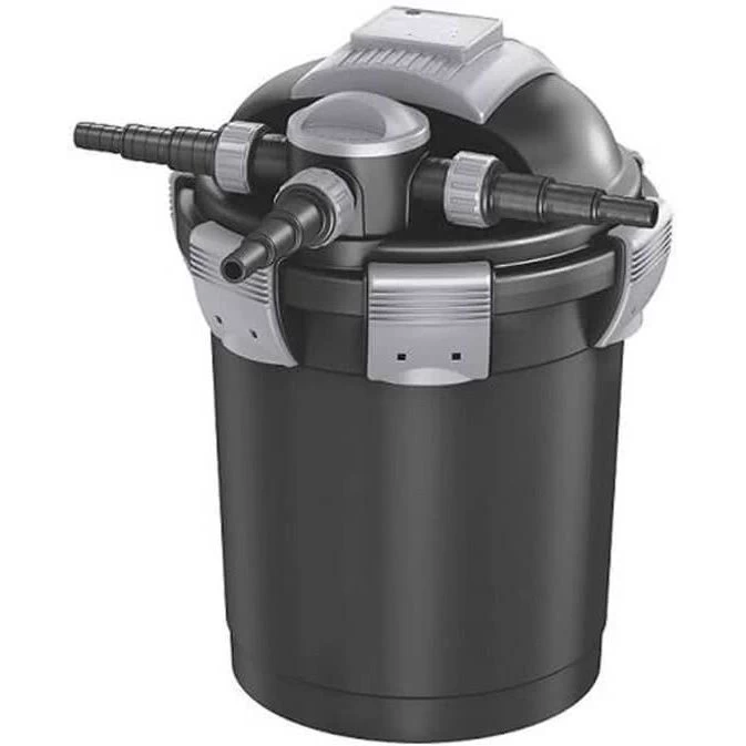 • Alle aansluitingen op de deksel. Hierdoor kan het filter bijna geheel worden ingegraven of weggewerkt naast de vijver.
