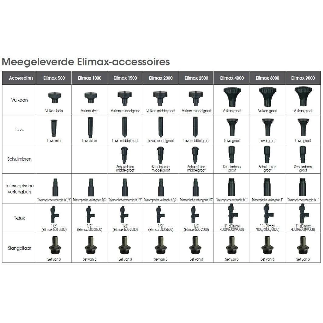 De Ubbink Elimax 1000 word geleverd inclusief aansluitmateriaal en 2 sproeikoppen. Bij de Elimax 1000 zit een vulkaan sproeikop, deze creëert een fontein in de vorm van een vulkaan en een waterbel sproeikop, deze creëert een bel boven het wateroppervlak. Bij een fonteinpomp moet je goed rekening houden met de grote van je vijver, neem je een te grote fonteinpomp dan zou het water naast de vijver terecht kunnen komen. Voor de Elimax 1000 moet de diameter minimaal 75 cm zijn. De Elimax-fonteinpompen zijn gemakkelijk in gebruik.